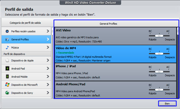 5. Ahora selecciona el formato, puede ser MP4 en general, u optimizado para Android o iPhone, y dale clic al botón “Bien”. En la parte izquierda, encontrarás algunos otros perfiles optimizados para diferentes modelos de dispositivos móviles.